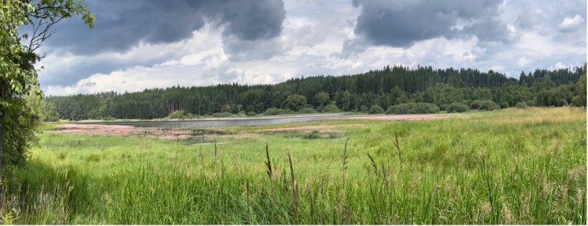 Der Flachauer Teich (25 ha) und seine Umgebung in der Potenzialfläche Ottensteiner Seenplatte (Knollconsult 2025) sind geprägt von flutendem Wasser-Knöterich (rosa blühend), kleinen Schilfröhrichten, Seggenbeständen und ausgedehnten Sumpfwiesen; 30.07.2025 (© E. Kraus)