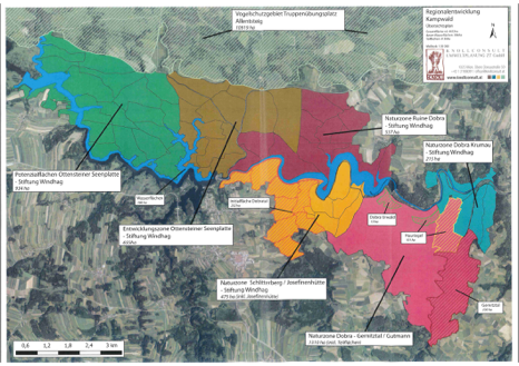 - Die Planungen wurden bisher vom Büro Knoll (Wien) im Auftrag des Landes umgesetzt, sie sollen sich im Wesentlichen auf Flächen des Gutes Ottenstein der Windhag-Stipendienstiftung (3.120 ha) und allenfalls dazwischen liegende Waldflächen der FV Jaidhof beziehen, im möglichen geschätzten Gesamtausmaß von etwa 4.000 ha.